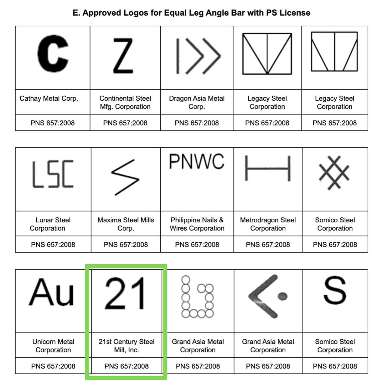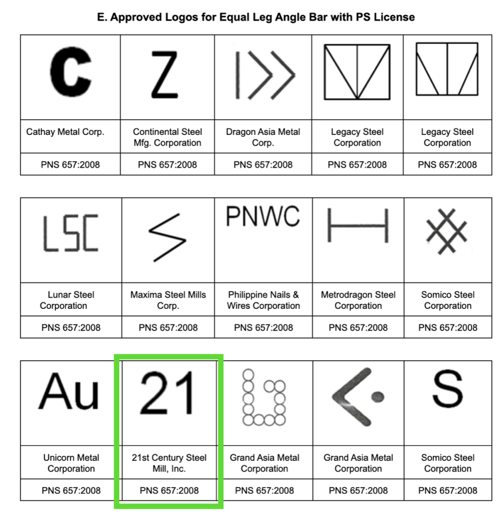 1. Dapat mayroong marka na naka embossed tulad ng larawan sa ibaba. Manufacturer’s logo, leg dimension and grade should be visible. Ito ay makikita sa bawat isang metro ng bakal. 21st Century Steel Mill, Inc.’s manufacturer’s logo is “21”.